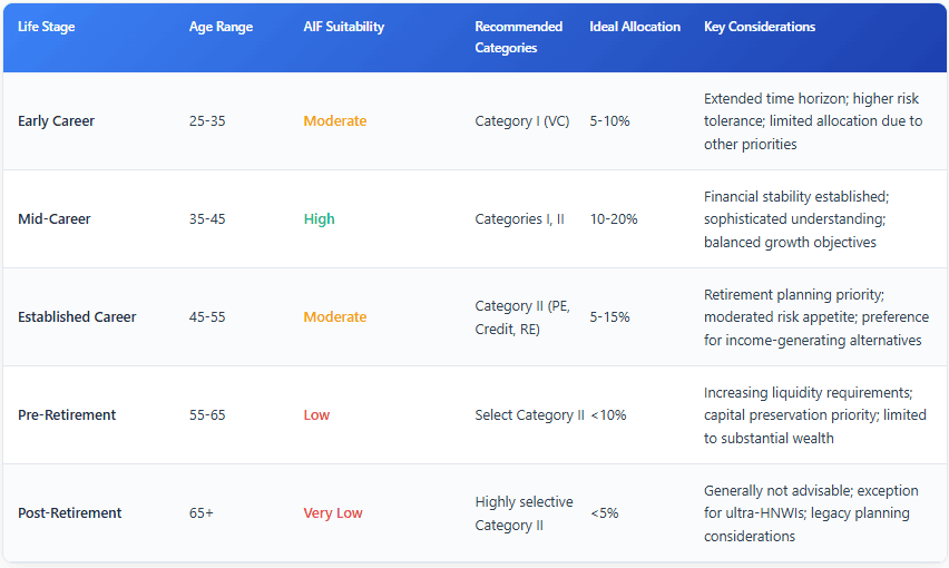 Aggressive Risk Investors: Can consider broader AIF exposure in early/mid-career stages