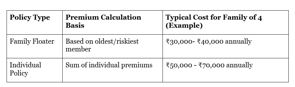 Family floater policies usually cost less than individual policies for each family member. This is because the insurance company puts everyone together and expects that not all members will need to make a claim at the same time. Individual policies set premiums based on the age, health, and risk profile of each member.