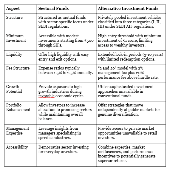 Sectoral funds and alternative investment funds offer distinct opportunities for different investor profiles. Sectoral funds provide accessible, liquid exposure to specific industries for investors wanting to express strategic views. On the other hand, alternative investment funds offer sophisticated strategies and private market access to qualified investors who are willing to accept illiquidity and complexity.