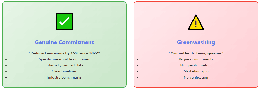 To spot greenwashing in your investments, look for specific, measurable outcomes rather than vague commitments. For example, a company serious about sustainability reports exact figures, "reduced emissions by 15% since 2022", and not just "committed to being greener."