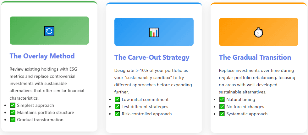 The gradual transition allows you to replace investments over time during your regular portfolio rebalancing. To determine where to start, focus on areas with well-developed sustainable alternatives. Large-cap ESG equity funds, green bonds, and renewable energy sectors typically offer the most mature options with competitive performance.