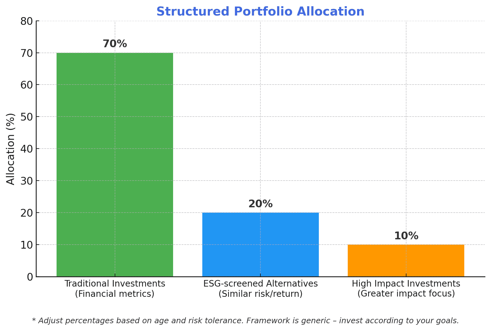 For a structured approach, you can consider the 70-20-10 framework for your portfolio. This means you allocate 70% to traditional investments based on financial metrics, 20% to ESG-screened alternatives with similar risk/return profiles, and 10% to high-impact investments where you might accept slightly lower returns for greater positive impact.