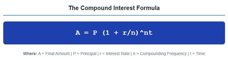 The compound interest formula helps you figure out how much money you’ll have in the future based on these four things.