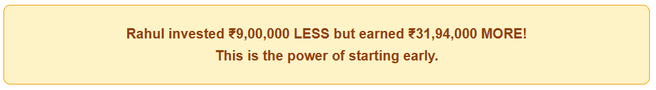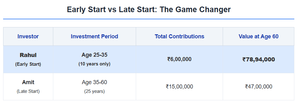 Rahul: Begins investing ₹5,000 monthly at age 25 and continues until he turns 35, totalling 10 years of contributions. He then stops adding new funds but leaves his investment to grow until retirement.