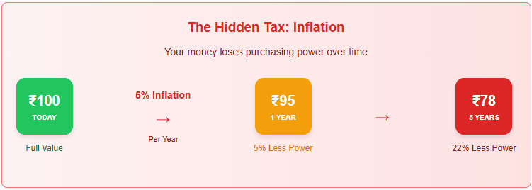 Inflation is a hidden tax on your income. It reduces the value of money over time. For example, if something costs ₹100 today, it might cost ₹105 next year if inflation is 5%. That means the same ₹100 won't buy the same thing after one year.