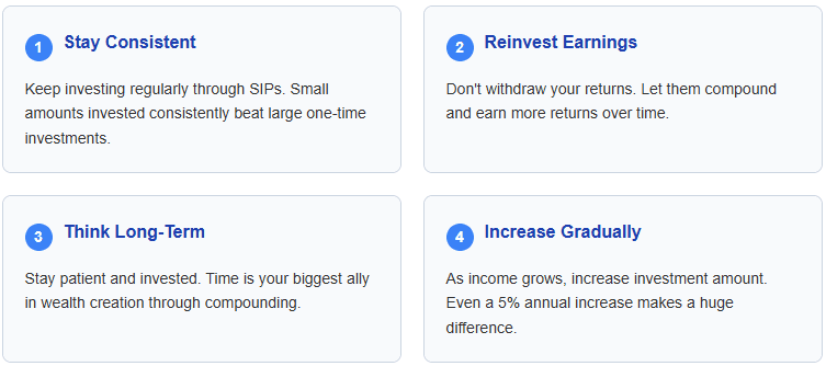 Compounding helps you build wealth over time. Even small, regular investments can turn into a large corpus if given enough time. The key is to start early, stay consistent, and let your money grow.