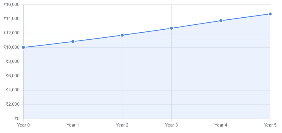So, after 5 years, your investment would grow to approximately ₹14,693. The compound interest earned would be ₹4,693.