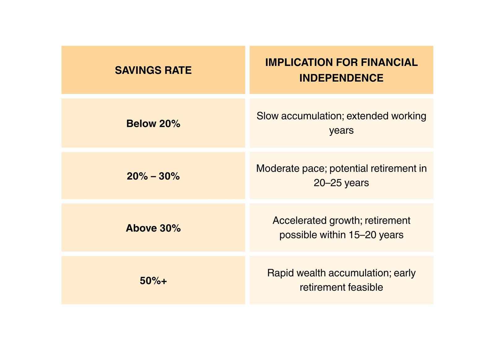 Your savings rate affects how quickly you can reach financial independence. Reaching important milestones like 20%, 30%, or even 50% savings can speed up your path to financial freedom.